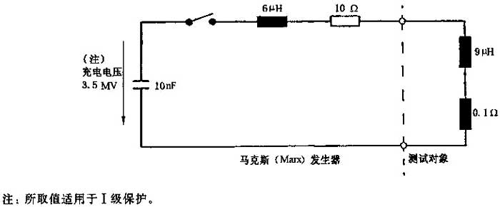 規(guī)定了測試參數(shù)并示出了測試發(fā)生器的電路圖,可利用這些參數(shù)及發(fā)生器來模擬與直接雷擊相關的雷電流的快速上升部分。此模擬適用于首次短時雷擊及后續(xù)短時雷擊的模擬。