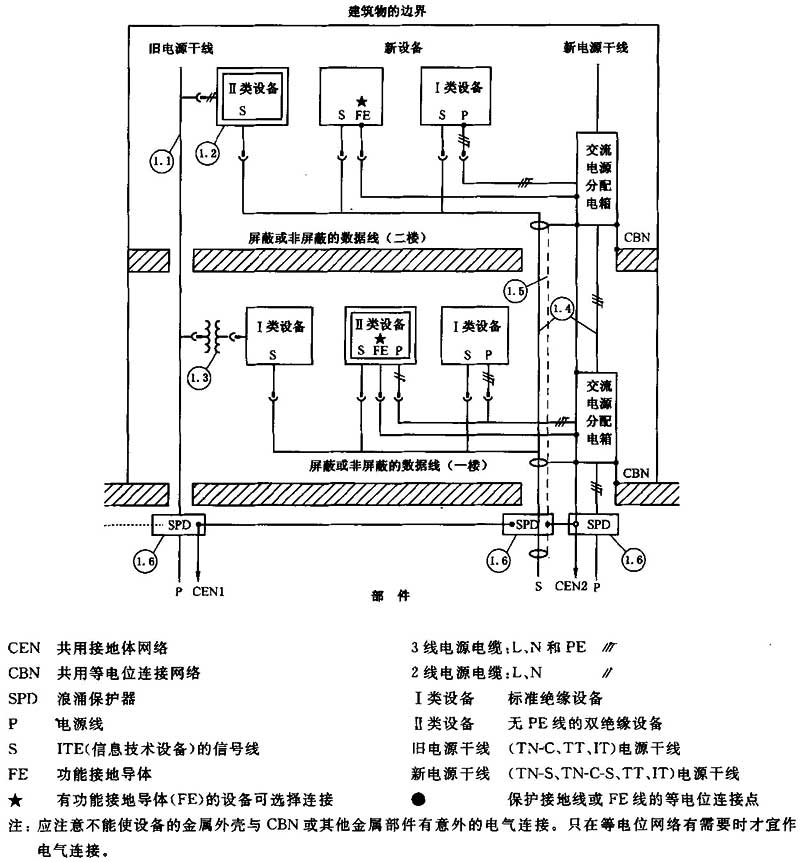 圖1 建筑物內(nèi)有兩個(gè)不同電源時(shí),改善新裝設(shè)施的防雷及EMC的若干措施[1]