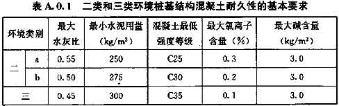 A. 0.1 二類和三類環(huán)境中,設計使用年限為50年的樁基結構混凝土耐久性應符合表A.0. 1的規(guī)定。