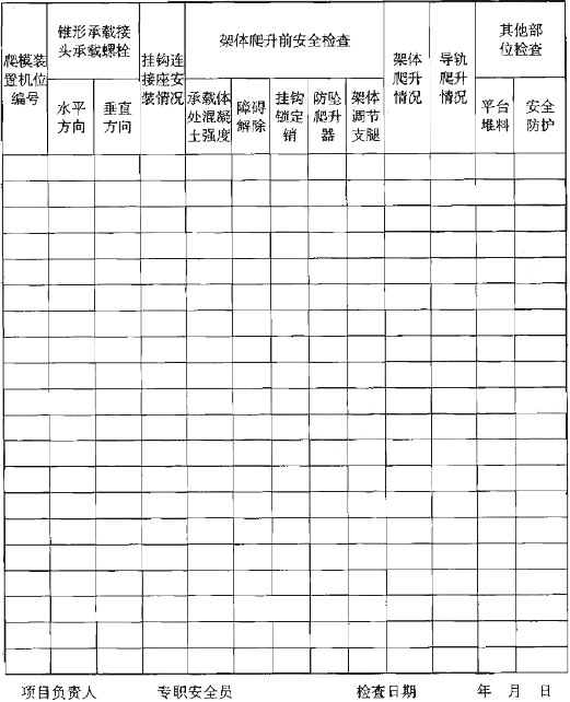 9.0.4 爬模工程應(yīng)設(shè)專職安全員,負(fù)責(zé)爬模施工的安全監(jiān)控,并填寫安全檢查表。
