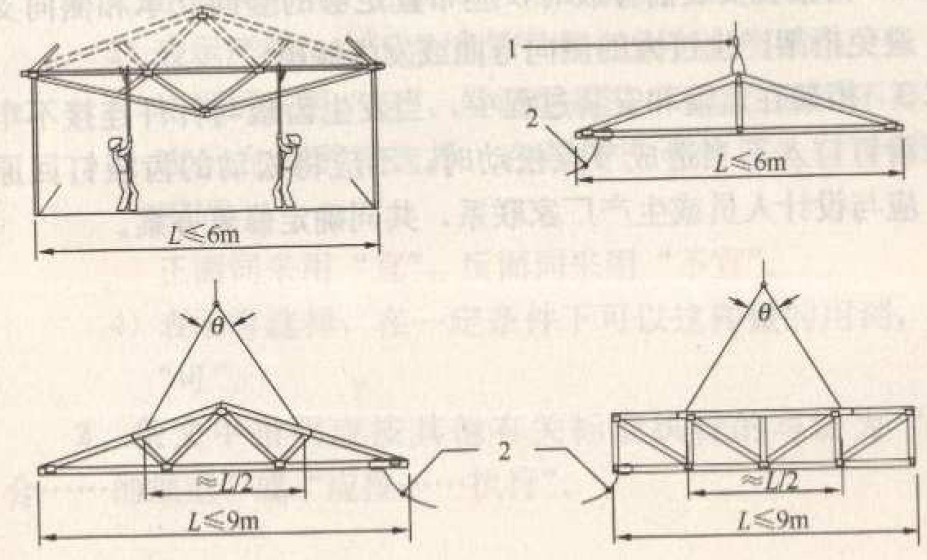 1 當(dāng)桁架跨度為L≤6m時(shí),可采用單點(diǎn)起吊,或采用人工搬運(yùn);