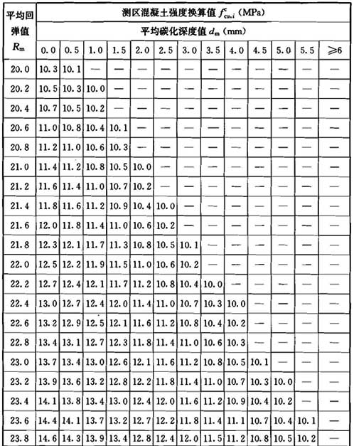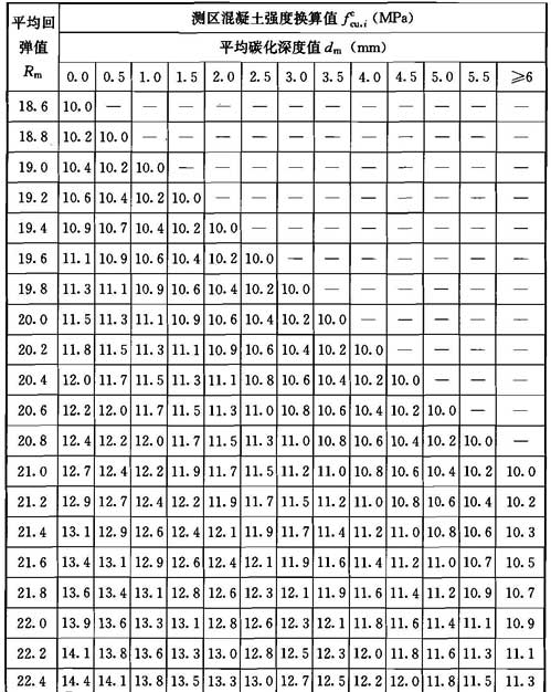 7.0.1 構(gòu)件第i個測區(qū)混凝土強度換算值,可按本規(guī)程第5章所求得的平均回彈值(Rm)及按本規(guī)程第4.3條所求得的平均碳化深度值(dm)由本規(guī)程附錄A、附錄B查表或計算得出。當有地區(qū)或?qū)S脺y強曲線時,混凝土強度的換算值宜按地區(qū)測強曲線或?qū)S脺y強曲線計算或查表得出。