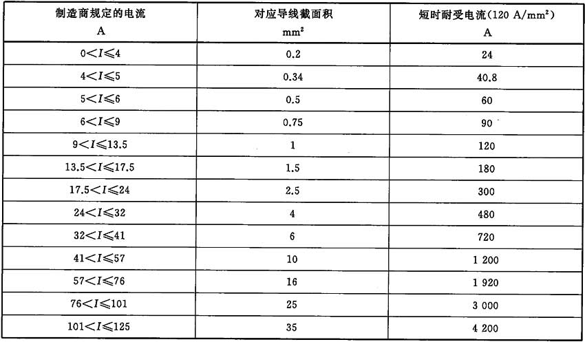 表D.4 短時耐受電流和對應(yīng)的導線尺碼(mm2)