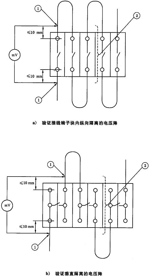 在進行上述a)、b)、c)、d)和e)的試驗前,試驗用隔離接線端子塊上的電壓降不應(yīng)超過1.6mV乘以導線夾緊件與隔離件觸點總數(shù)的值。如果測量值超過計算值,則在每個獨立的導線夾緊件及隔離件觸點上測量電壓降。任意導線夾緊件或隔離件的觸點上的電壓降都不應(yīng)超過1.6mV。