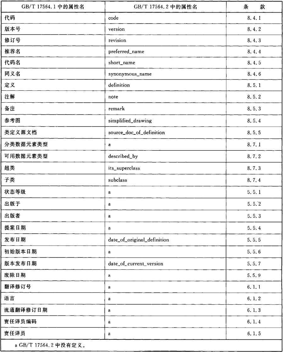 表6 GB/T 17564.1中定義的屬性列表及其在GB/T 17564.2中的對(duì)應(yīng)名稱