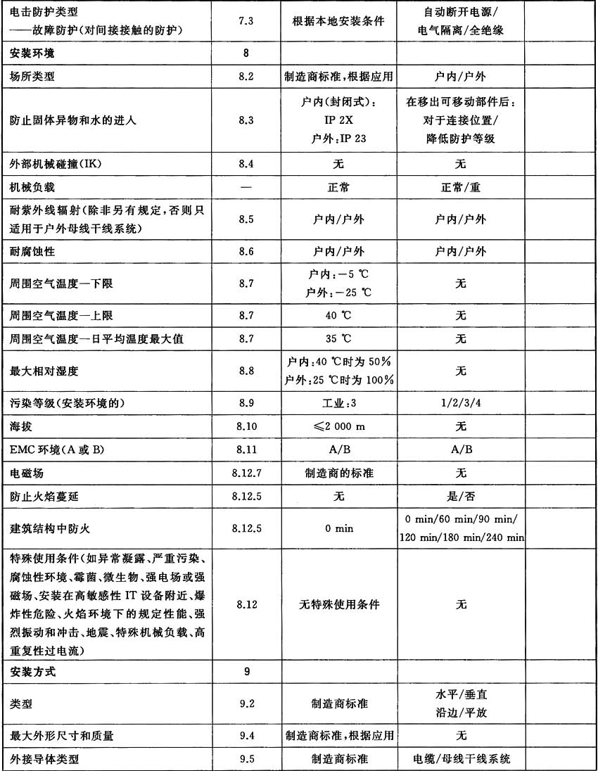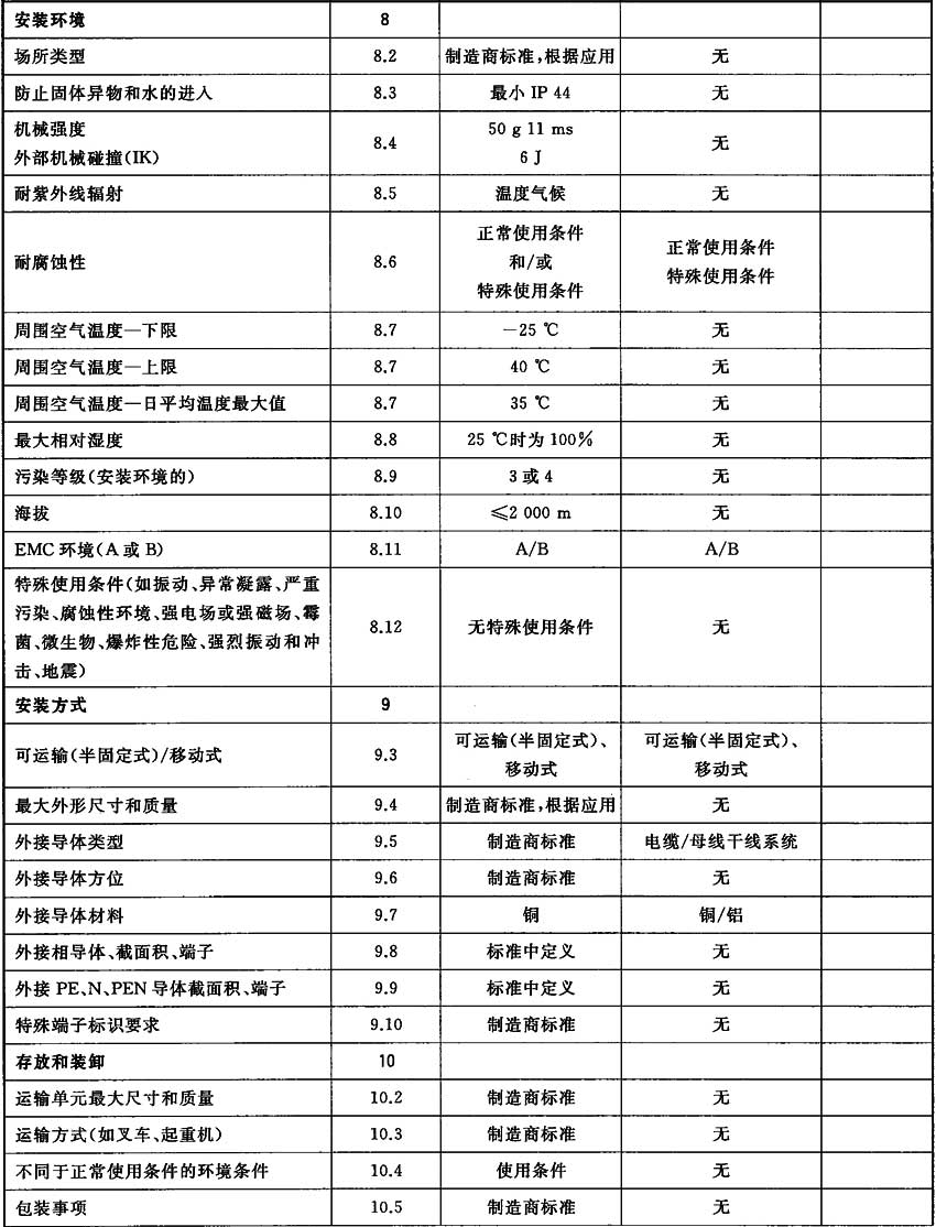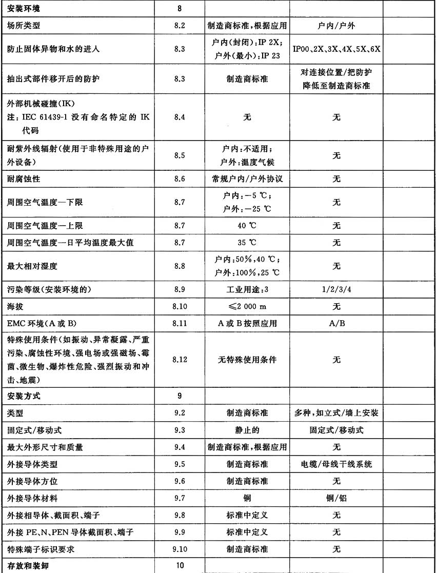 依據(jù)GB 7251的相關(guān)成套設(shè)備標(biāo)準(zhǔn)制造的成套設(shè)備,適用于安裝在多數(shù)工作環(huán)境中。成套設(shè)備的很多特性在標(biāo)準(zhǔn)中都有完整定義,并且不需要用戶更多考慮。在一些情況下,在標(biāo)準(zhǔn)中規(guī)定了缺省條件以及其他指定的可替代的選項(xiàng),用戶可從選項(xiàng)中選擇以滿足應(yīng)用。對(duì)于其他特性,可要求用戶在標(biāo)準(zhǔn)選項(xiàng)表中選擇。