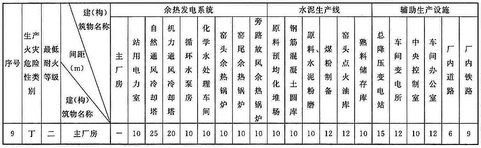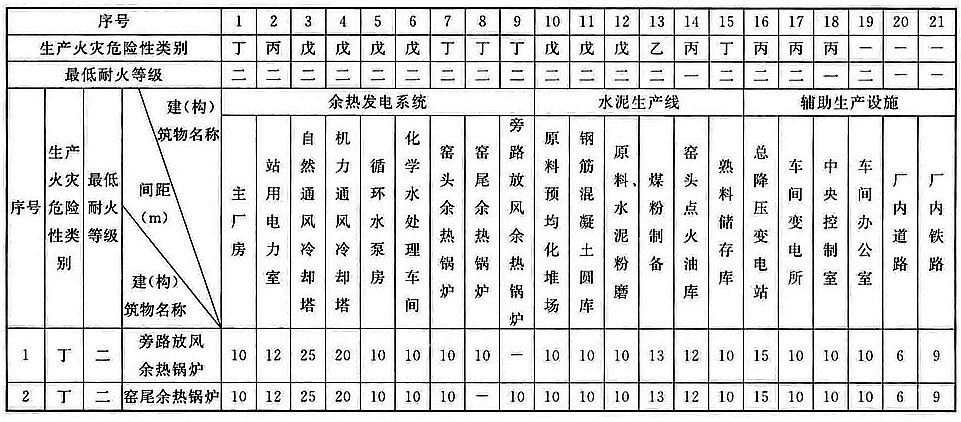 附錄A 余熱發(fā)電和水泥生產(chǎn)線建(構(gòu))筑物的火災(zāi)危險性類別、耐火等級及最小防火間距