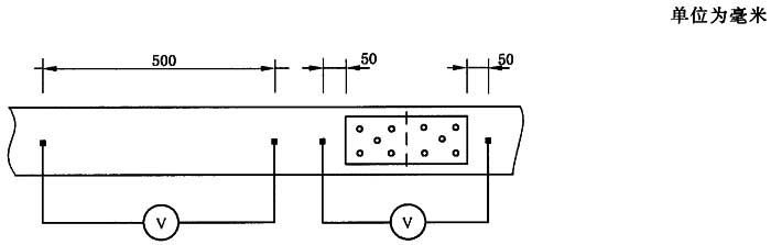 用電壓為12V、頻率為50Hz~60Hz、電流為25A±1A的交流電流恒流源通過試樣,在距連接板兩端各50mm處的兩個點上測量電壓降;然后再測量接頭一邊距離500mm的兩個點之間的電壓降。