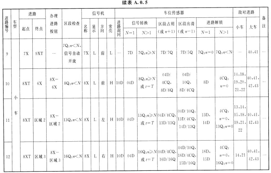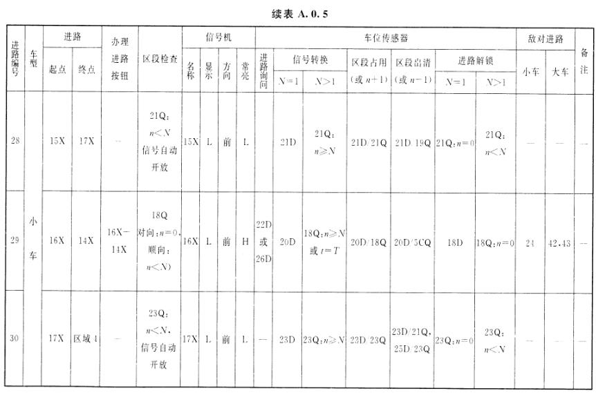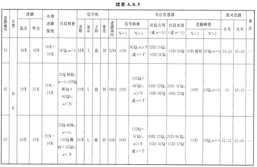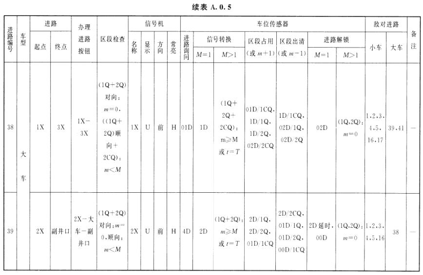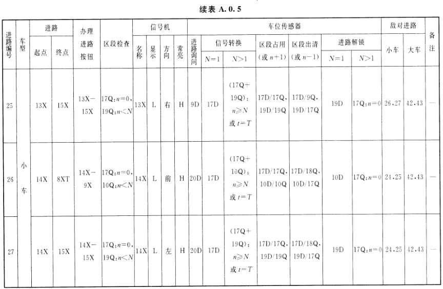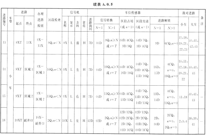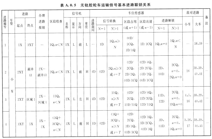 A.0.5無軌膠輪車運輸信號基本進路聯(lián)鎖關系應符合表A.0.5的規(guī)定。