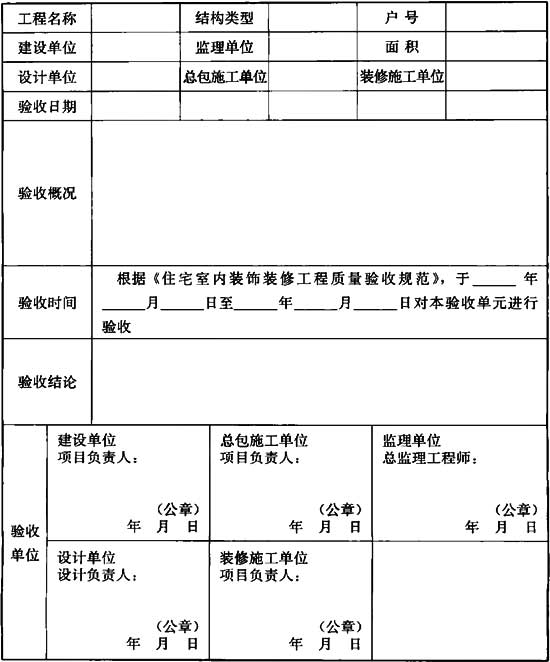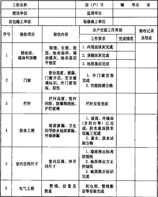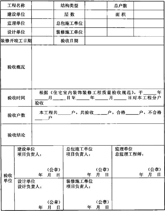 3 根據(jù)每戶分項(xiàng)工程質(zhì)量驗(yàn)收記錄,按本規(guī)范附錄E和附錄F填寫住宅室內(nèi)裝飾裝修分戶工程質(zhì)量驗(yàn)收匯總表和住宅室內(nèi)裝飾裝修工程質(zhì)量驗(yàn)收匯總表。