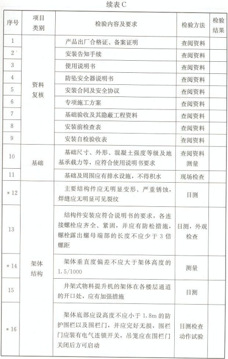現(xiàn)批準《建筑施工升降設備設施檢驗標準》為行業(yè)標準,編號為JGJ 305-2013,自2014年1月1日起實施。其中,第3.0.7、4.2.9、4.2.15、5.2.8、6.2.9、7.2.15、8.2.8條為強制性條文,必須嚴格執(zhí)行。