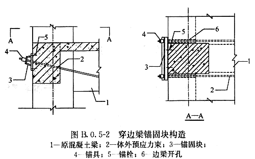 2 當(dāng)加固梁端部有邊梁時(shí),可在邊梁上鉆孔,體外束穿過(guò)邊梁錨固在加固梁中性軸稍偏上的位置(圖B.0.5-2);