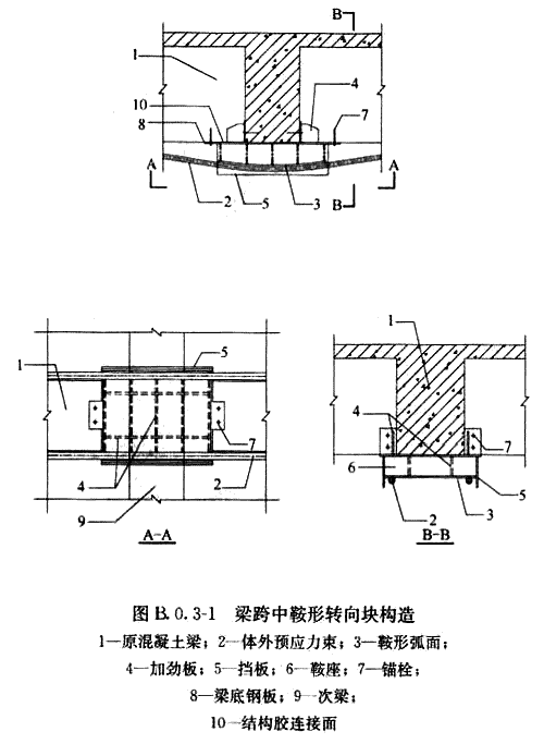 B.0.3 當(dāng)轉(zhuǎn)向塊為鞍形時(shí),預(yù)應(yīng)力束套管可在鞍形轉(zhuǎn)向塊上平順通過(guò),并宜通過(guò)擋板固定預(yù)應(yīng)力束位置,轉(zhuǎn)向塊構(gòu)造及與加固梁的連接可采用下列形式:
