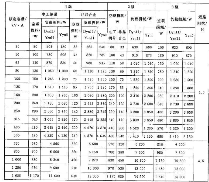油浸式配電變壓器的空載損耗值和負(fù)載損耗值均應(yīng)不高于表1中3級(jí)的規(guī)定。干式配電變壓器的空載損耗值和負(fù)載損耗值均應(yīng)不高于表2中3級(jí)的規(guī)定。