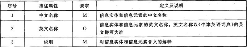 以摘要形式對信息實體和信息元素的中文名稱、英文名稱、說明、數(shù)據(jù)類型及格式、約束/條件、同義詞、值域、計量單位和備注等九個屬性進行完整說明。