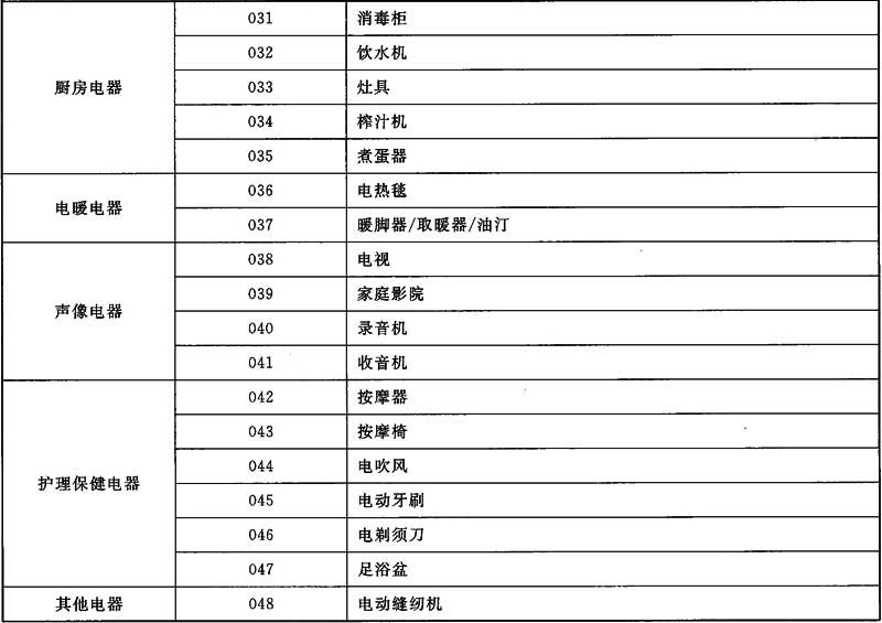 表A.1 家用電器產(chǎn)品分類