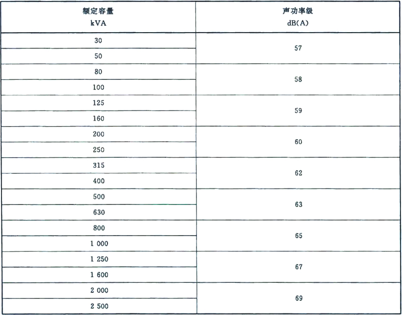 5.3 變壓器的聲功率級(jí)應(yīng)不超過(guò)表2規(guī)定的限值。
