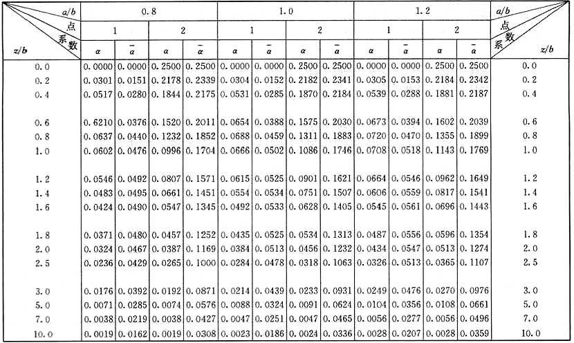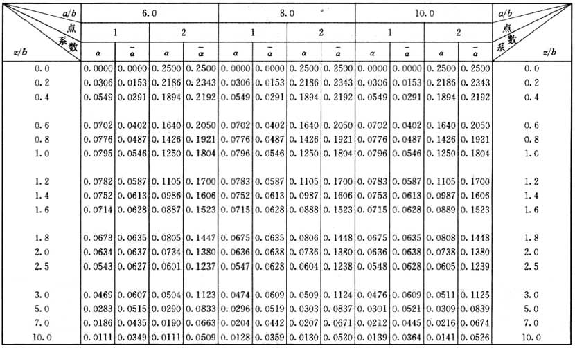 注:a——矩形均布荷載長度(m);b——矩形均布荷載寬度(m);z——計算點離基礎底面或樁端平面垂直距離(m)。