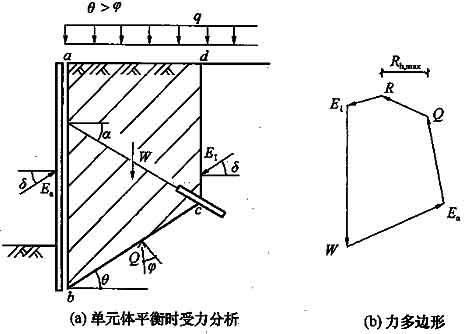 B.0.1 單排錨桿支護(hù)的整體穩(wěn)定性驗(yàn)算可采用Kranz方法(圖B.0.1),由錨固體中心c向擋土結(jié)構(gòu)下端假設(shè)支點(diǎn)b連成一條直線,并假設(shè)bc線為深部滑動(dòng)線,再通過(guò)c點(diǎn)垂直向上作直線cd,這樣abcd塊體上除作用有自重W外,還作用有Ea、E1和Q。當(dāng)塊體處于平衡狀態(tài)時(shí),可利用力多邊形求得錨桿承受的最大拉力Rmax ,其水平分力Rh,max與錨桿抗拔力特征值的水平分力之比為整體穩(wěn)定性安全系數(shù)。