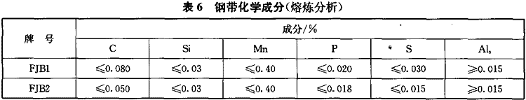 Q195冷軋鋼帶成分(熔煉分析)符合GB/T 700有關(guān)規(guī)定,其余鋼帶牌號及其化學成分(熔煉分析)符合表6規(guī)定,成品化學成分允許偏差符合GB/T 222有關(guān)規(guī)定。