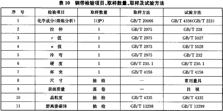 7.1 每批鋼帶的檢驗項目、取樣數(shù)量、取樣及試驗方法應(yīng)符合表10的規(guī)定。