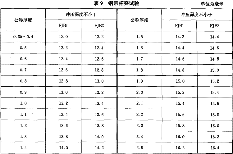 根據(jù)需方要求,經(jīng)供需雙方協(xié)商,并在合同中注明,供方可提供制作沖壓板鋼帶的杯突試驗實際檢驗結(jié)果,其數(shù)值可參考表9,但不作為判定合格的依據(jù)。