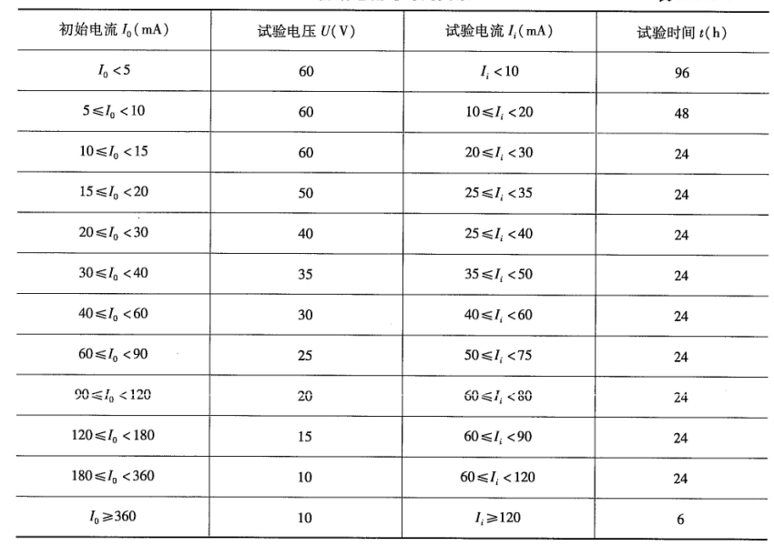 (9)接通電源,調(diào)節(jié)各回路電壓到30V,分別觀察各回路初始電流,根據(jù)初始電流值從表B.0.3-1中選擇試驗(yàn)電壓;根據(jù)實(shí)際施加的試驗(yàn)電壓測得的試驗(yàn)電流,選擇試驗(yàn)時(shí)間進(jìn)行試驗(yàn);