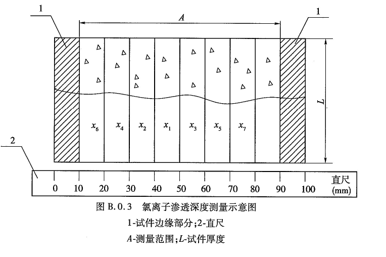 (13)用兩腳規(guī)和游標(biāo)卡尺測量白色AgCl標(biāo)示的滲透深度,從正中間向兩邊每隔10mm測量一個(gè)數(shù)據(jù),精確到0.1mm,共測得7個(gè)數(shù)據(jù),測量位置如圖B.0.3所示,滲透深度記錄表如表B.0.3-2所示。