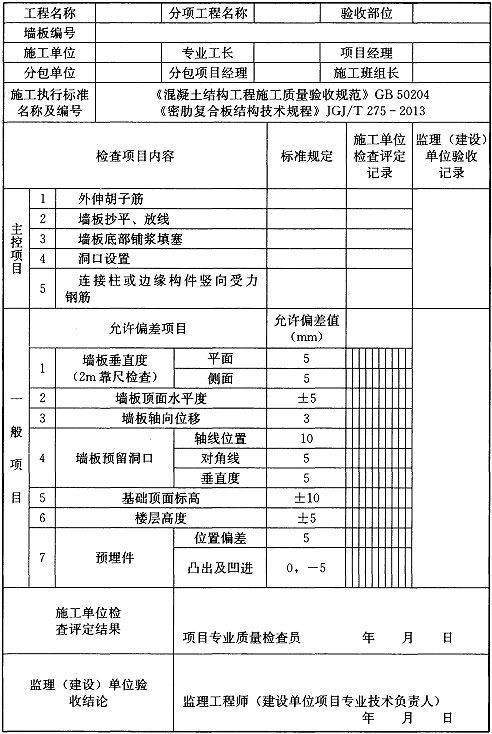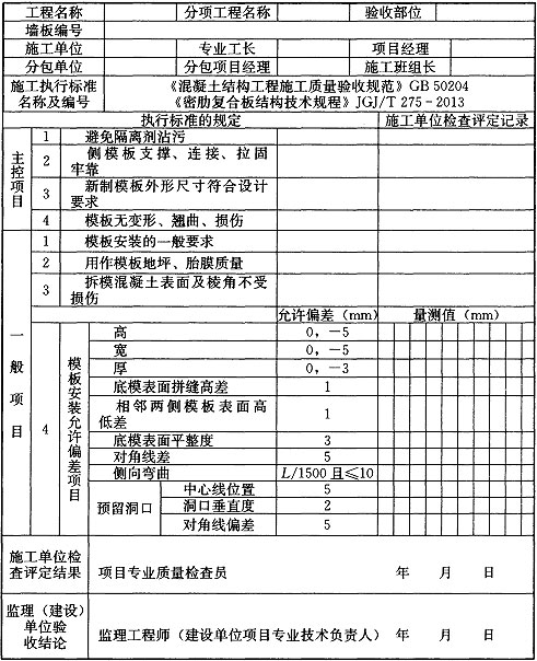 表D.0.1 密肋復合墻板模板檢驗批質量驗收記錄