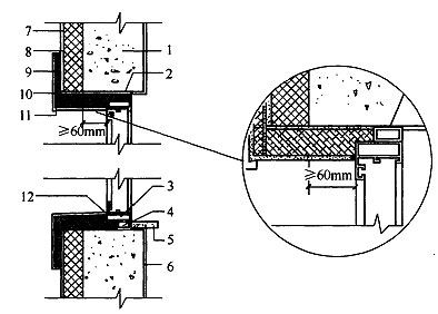 8—抗裂砂漿厚抹面層;9—無空腔粘貼層;10—無機材料保溫層;11—滴水線;12—密封膏嵌縫