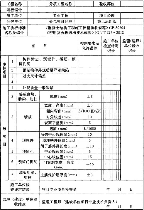 D.0.3 密肋復合墻板檢驗批質量驗收可按表D.0.3記錄。