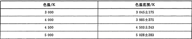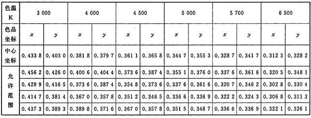 LED路燈顯色指數(shù)應(yīng)大于70,光效初始值等級(jí)應(yīng)符合表2的規(guī)定,色溫分級(jí)應(yīng)符合表3的規(guī)定,色品坐標(biāo)應(yīng)符合表4的規(guī)定。