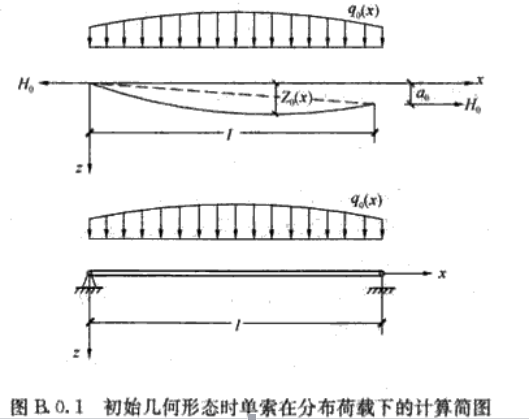 B.0.1 在初始任意分布荷載q0(x)下,單索的初始幾何形態(tài)宜按下式計(jì)算(圖B. 0.1):