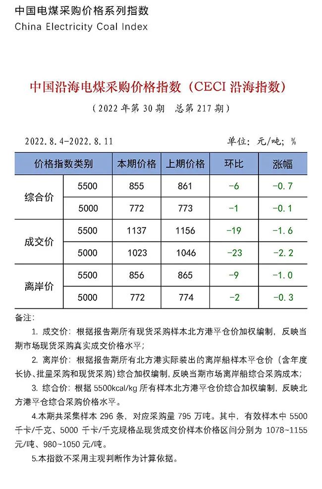 中國(guó)電煤采購(gòu)價(jià)格CECI系列指數(shù)(2022年8月4日-8月11日)中國(guó)電煤采購(gòu)價(jià)格CECI系列指數(shù)(2022年8月4日-8月11日)