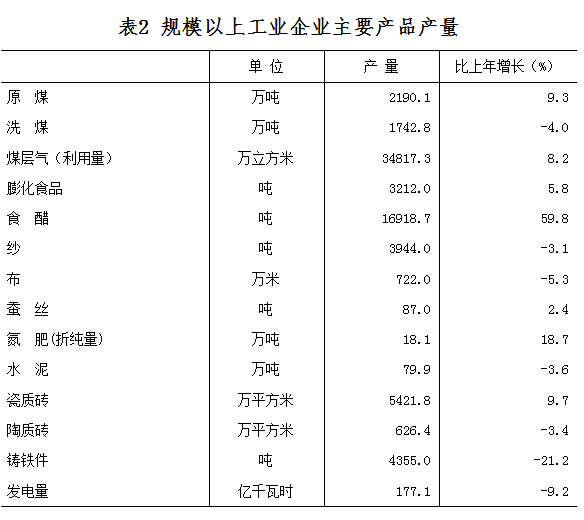 全年規(guī)模以上工業(yè)企業(yè)生產(chǎn)原煤2190.1萬(wàn)噸,增長(zhǎng)9.3%;洗煤1742.8萬(wàn)噸,下降4.0%;煤層氣34817.3萬(wàn)立方米,增長(zhǎng)8.2%;膨化食品3212.0噸,增長(zhǎng)5.8%;食醋16918.7噸,增長(zhǎng)59.8%;紗3994.0噸,下降3.1%;布722.0萬(wàn)米,下降5.3%;蠶絲87.0噸,增長(zhǎng)2.4%;氮肥(折純量)18.1萬(wàn)噸,增長(zhǎng)18.7%;水泥79.9萬(wàn)噸,下降3.6%;瓷質(zhì)磚5421.8萬(wàn)平方米,增長(zhǎng)9.7%;陶質(zhì)磚626.4萬(wàn)平方米,下降3.4%;鑄鐵件4355.0噸,下降21.2%;發(fā)電量177.1億千瓦時(shí),下降9.2%。