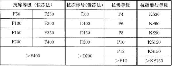 表3.0.1混凝土抗凍性能、抗水滲透性能和抗硫酸鹽侵蝕性能的等級(jí)劃分