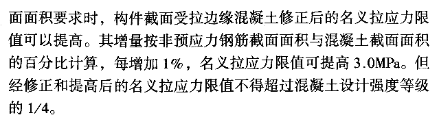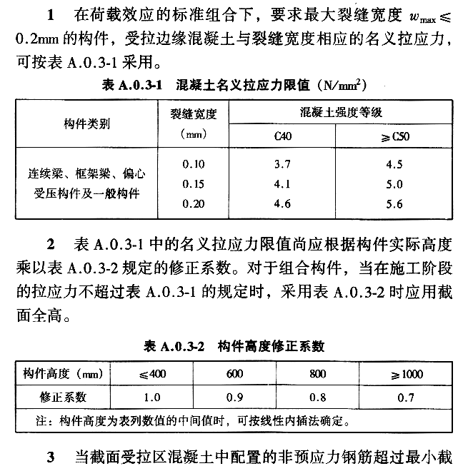 A.0.3 對按三級允許出現(xiàn)裂縫控制的無粘結(jié)預(yù)應(yīng)力混凝土連續(xù)梁和框架梁等,當(dāng)滿足本規(guī)程第5.2.1條非預(yù)應(yīng)力鋼筋最小截面面積要求時,可按下述經(jīng)修正和提高后的名義拉應(yīng)力值控制裂縫寬度: