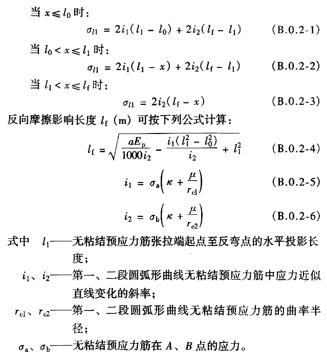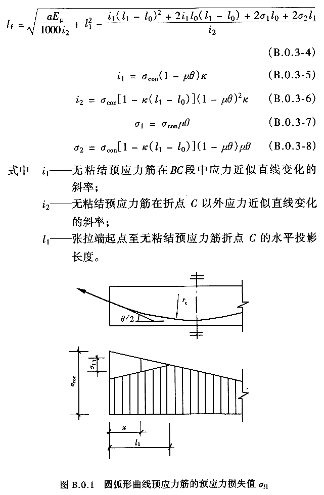 B.0.2 端部為直線(直線長度為l0),而后由兩條圓弧形曲線(圓弧對應(yīng)的圓心角θ≤90°)組成的無粘結(jié)預(yù)應(yīng)力筋(圖B.0.2),由于錨具變形和鋼筋內(nèi)縮,在反向摩擦影響長度lf范圍內(nèi)的預(yù)應(yīng)力損失值σl1可按下列公式計算: