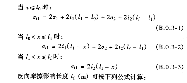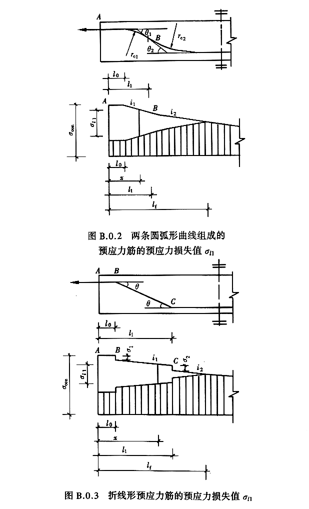 B.0.3 當(dāng)折線形無粘結(jié)預(yù)應(yīng)力筋的錨固損失消失于折點C之外時(圖B.0.3),由于錨具變形和鋼筋內(nèi)縮,在反向摩擦影響長度lf范圍內(nèi)的預(yù)應(yīng)力損失值σl1可按下列公式計算: