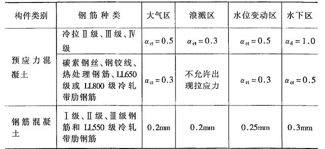 3.0.5 預(yù)應(yīng)力構(gòu)件在作用的頻遇組合(短期效應(yīng)組合)時的混凝土拉應(yīng)力限制系數(shù)αct和鋼筋混凝土構(gòu)件在作用的準(zhǔn)永久組合(長期效應(yīng)組合)時的最大裂縫寬度,不得超過表3.0.5規(guī)定的限值。
