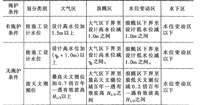 3.0.4 應(yīng)根據(jù)預(yù)定功能和混凝土建筑物部位所處的環(huán)境條件,對混凝土提出不同的防腐蝕要求和措施?;炷敛课豢筛鶕?jù)水域掩護(hù)條件和港工設(shè)計水位或天文潮位按表3.0.4的規(guī)定劃分。