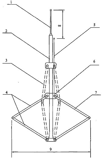 1—主測(cè)繩;2—主桿;3—收縮狀態(tài);4—測(cè)桿;5—副測(cè)繩;6—配重;7—張開(kāi)狀態(tài);8—落差;9—承力盤(pán)腔直徑