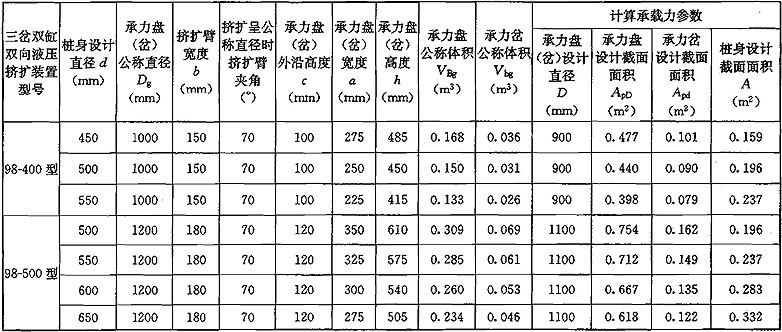 2 計(jì)算三岔雙向擠擴(kuò)灌注樁承載力時(shí),應(yīng)按表中承力盤(pán)和承力岔的設(shè)計(jì)直徑D、設(shè)計(jì)截面面積ApD和Apd取值;