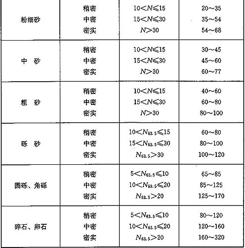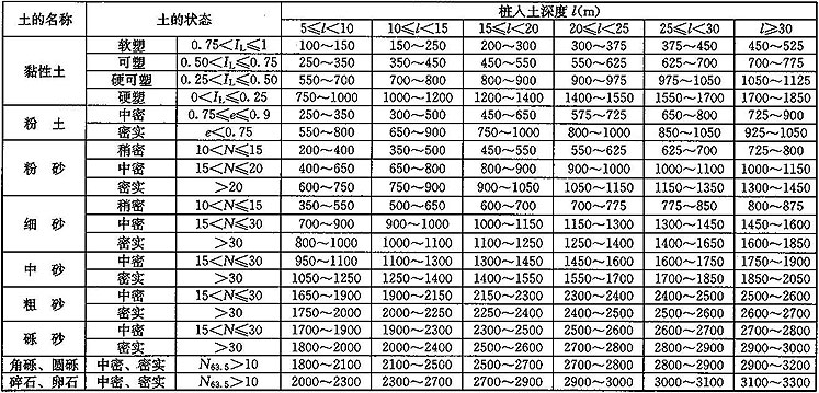 注:1 砂土和碎石類(lèi)土中樁的極限樁端阻力取值,宜綜合考慮土的密實(shí)度、樁端進(jìn)入持力層的深度比hb/d及成孔方法;密實(shí)的、hb/d大的土和干作業(yè)成孔時(shí)宜取高值;