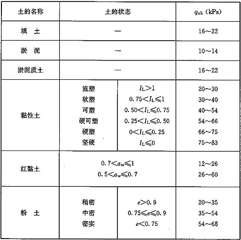 4 表中數(shù)值適用于老沉積土;對(duì)于新近沉積土,qsik應(yīng)按土的狀態(tài),降一級(jí)取值。