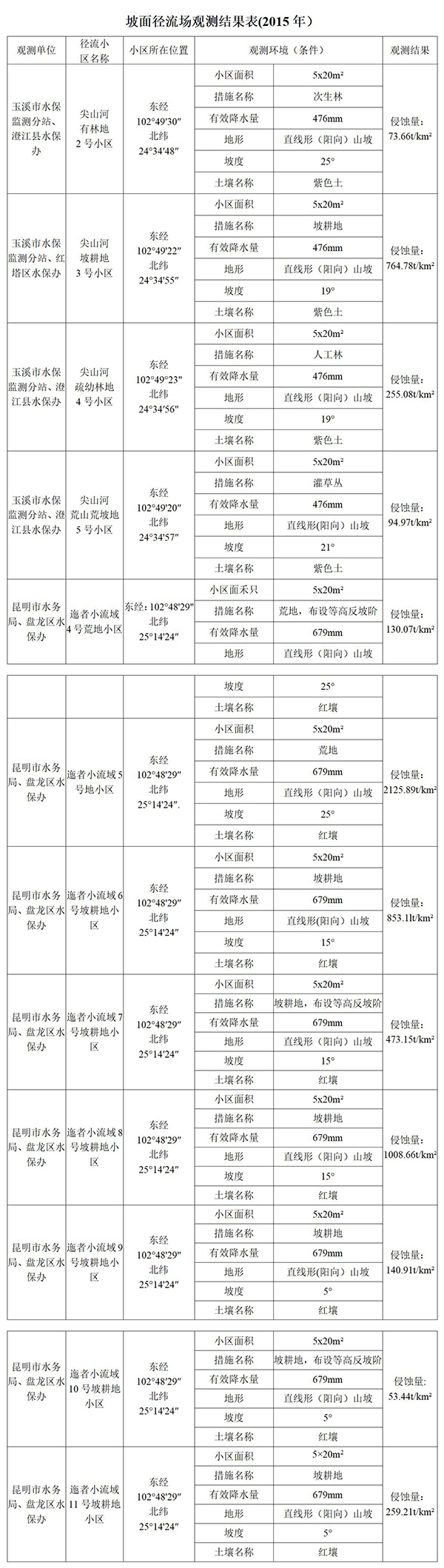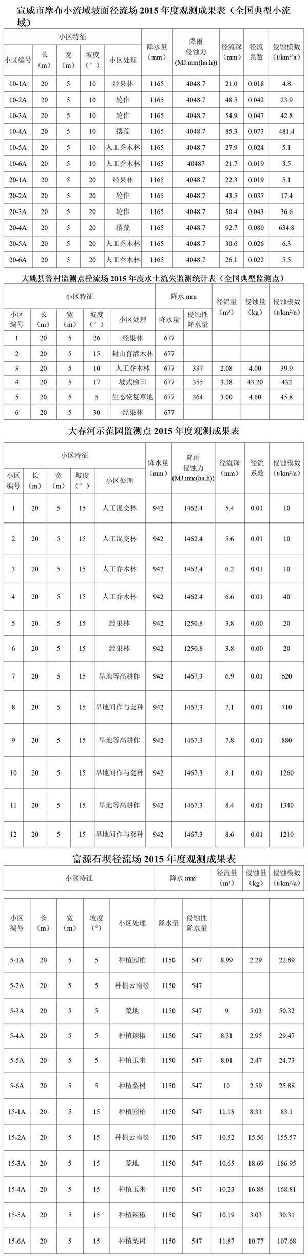 我省宣威市摩布小流域、大姚縣魯村監(jiān)測(cè)點(diǎn)、大春河示范園監(jiān)測(cè)點(diǎn)、富源石壩徑流場(chǎng)列入全國(guó)水土流失動(dòng)態(tài)監(jiān)測(cè)與公告項(xiàng)目。按照該項(xiàng)目的管理規(guī)定和技術(shù)要求,2015年度監(jiān)測(cè)成果如下:
