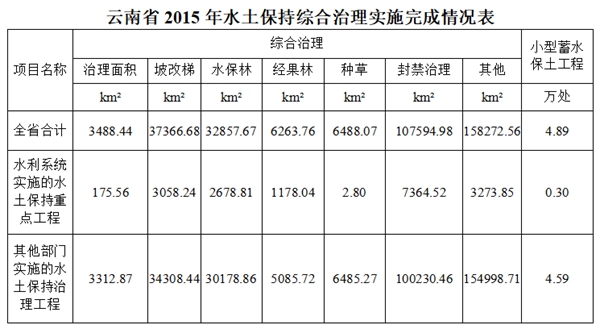 為加快我省水土流失治理,建設(shè)生態(tài)云南,綠色云南,2015年國(guó)家加大對(duì)我省的水土流失治理支待力度,通過發(fā)改、衣業(yè)、國(guó)土、林業(yè)等部門實(shí)施了鞏固退耕還林成果水土保持項(xiàng)目、重點(diǎn)退耕還林地區(qū)基本口糧田建設(shè)項(xiàng)目等。共完成冶理面積1346.42平方公里。