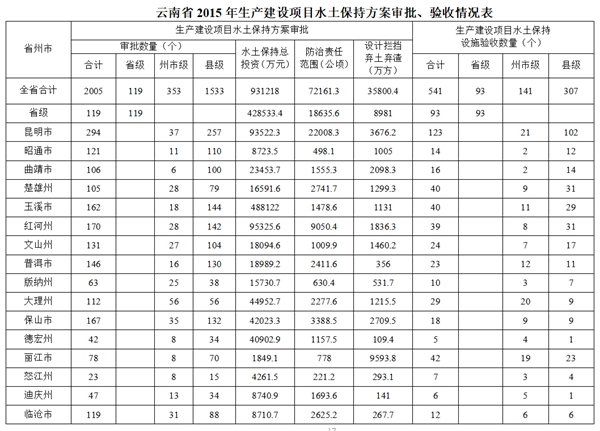 2015年我省共審批生產(chǎn)建設(shè)項(xiàng)目水上保持方案2005個(gè),其中省級(jí)119個(gè),州(市)級(jí)353個(gè),縣級(jí)1533個(gè)。設(shè)計(jì)投入水土保持資金93.12億元,防治責(zé)任范圍72161.3公頃,設(shè)計(jì)攔擋棄土棄渣35800.4萬立方米。