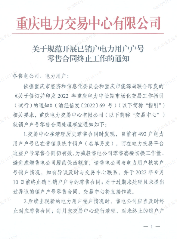 2022年|重慶規(guī)范開展已銷戶電力用戶戶號(hào)零售合同終止工作