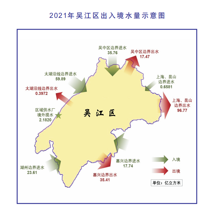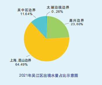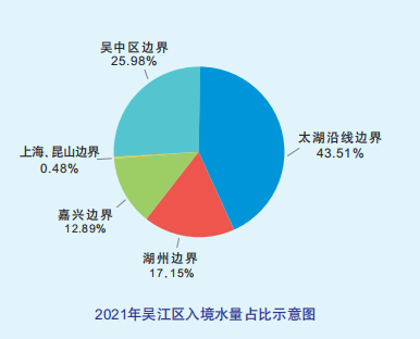 2021年全區(qū)入境水量139.8億立方米,其中太湖沿線邊界進(jìn)水59.89億立方米,湖州邊界進(jìn)水23.61億立方米,嘉興邊界進(jìn)水17.74億立方米,上海、昆山邊界進(jìn)水0.6581億立方米,吳中區(qū)邊界進(jìn)水35.76億立方米,區(qū)域供水廠境外提水2.182億立方米。